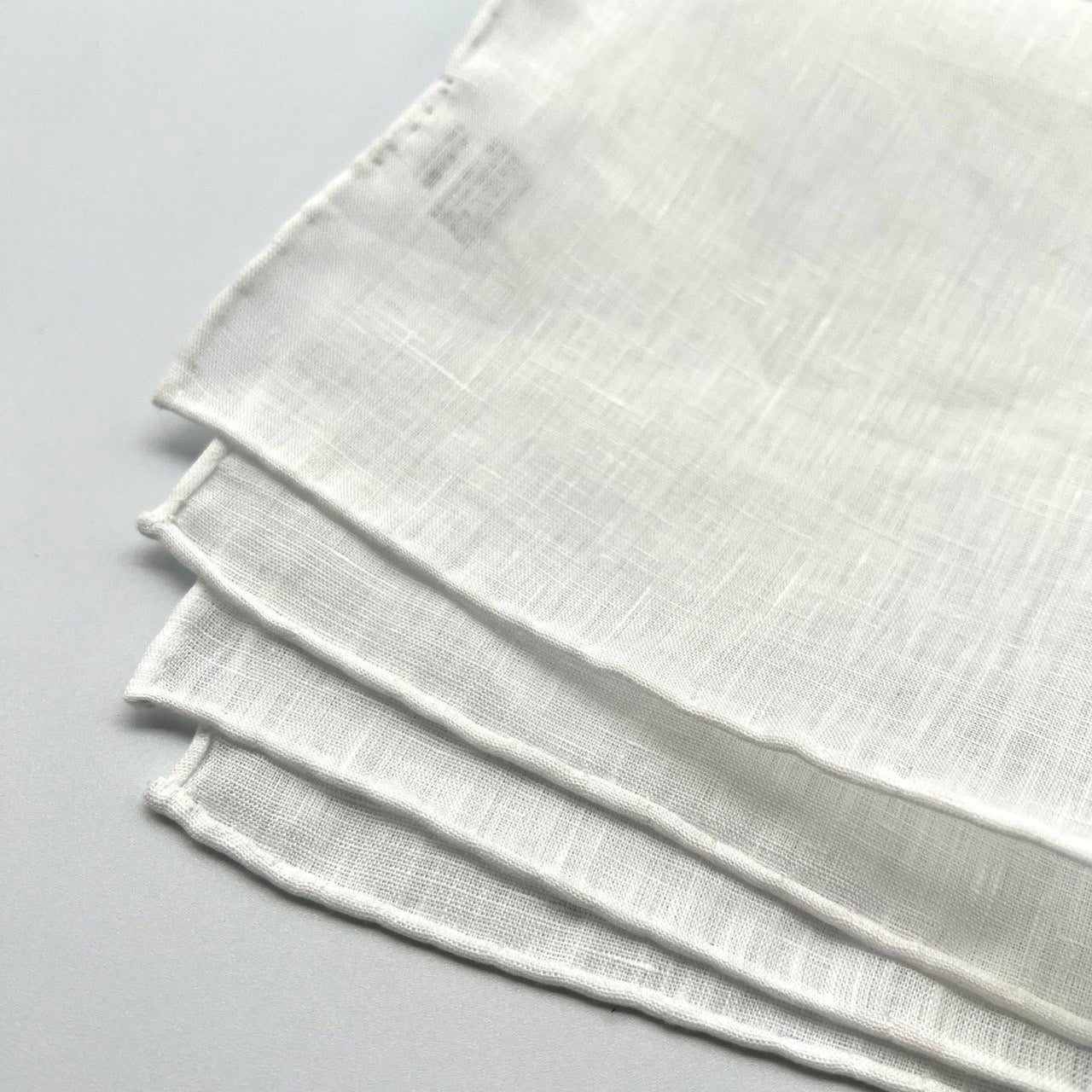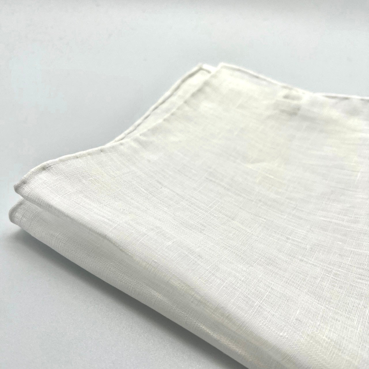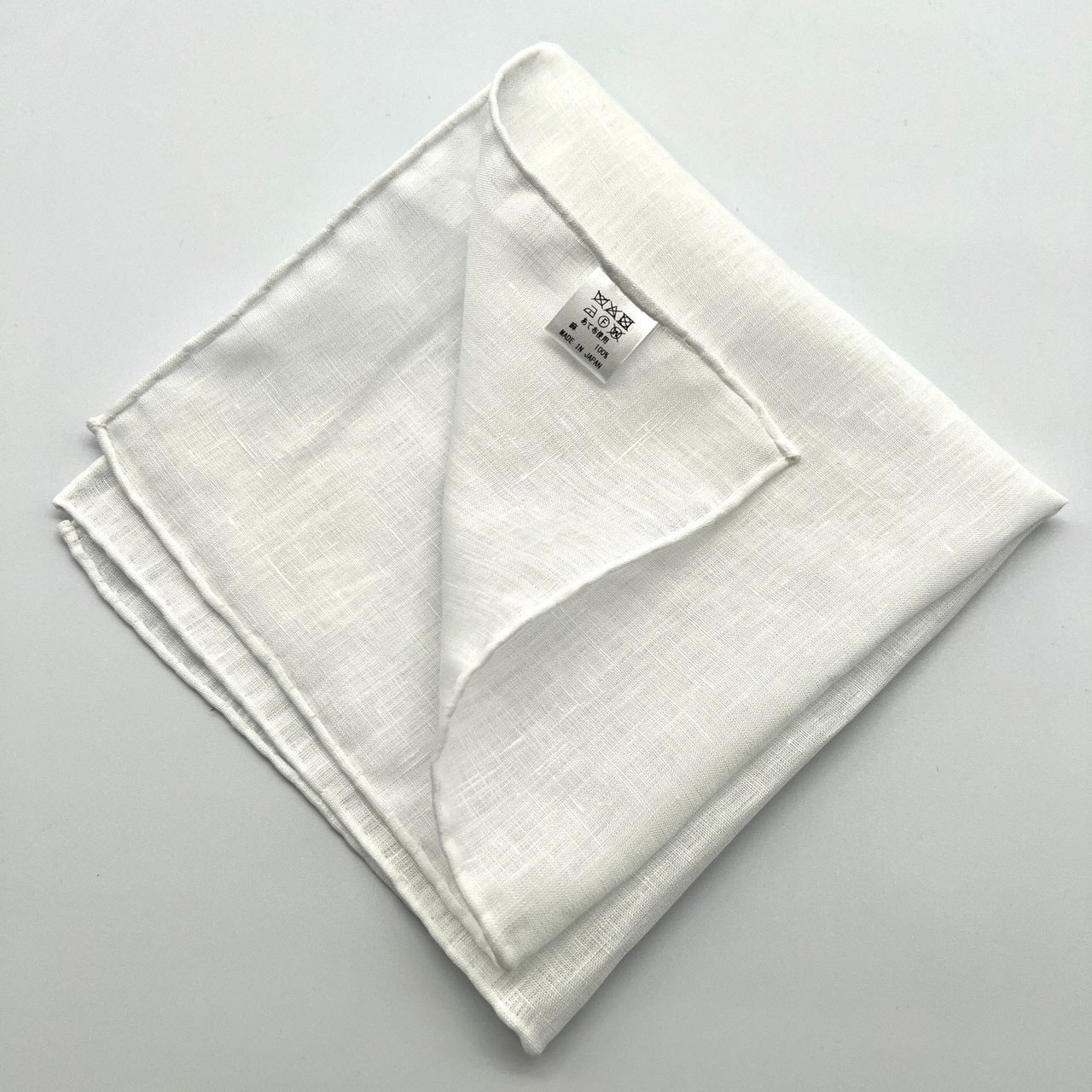 リネンのポケットチーフ。必ず1枚は手元において、あらゆるシーンにご活用下さい。挿し方はTVホールドをおすすめします。※縁部分は1枚1枚手巻きの手縫いで仕立てております。