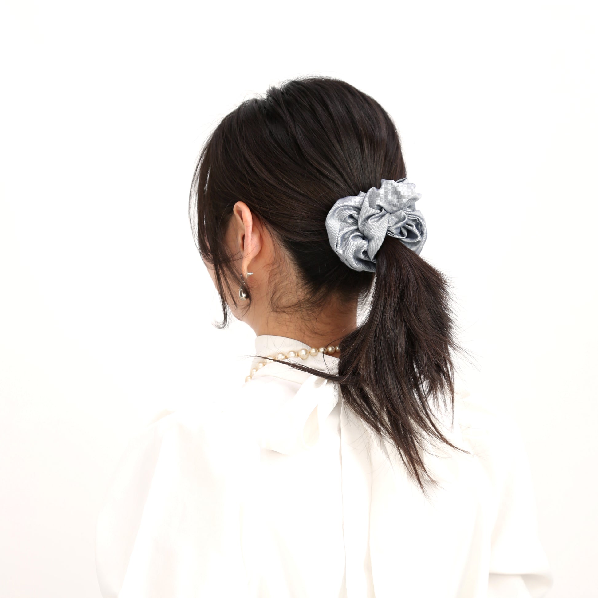 シルクコットンの素材は軽く、結びやすいため、シュシュとして使いやすい特性を持っています。リボンの形も美しく保たれ、髪に優しくフィットします。