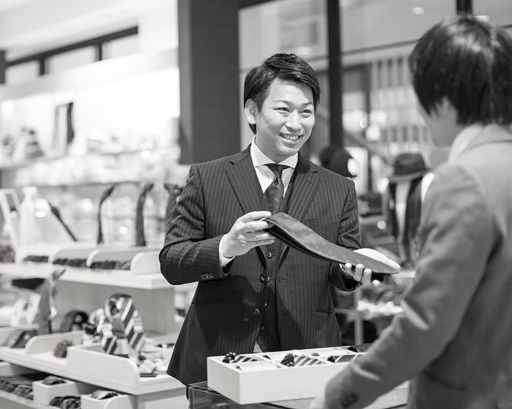 プロダクトマネージャーである笏本達宏は販売店に立ちユーザーと直接会話を行い新たな製品を生み出しながらも、現役の職人として今でも自らの手で作り上げることで、ユーザーの声を活かしたネクタイをお仕立てしています。